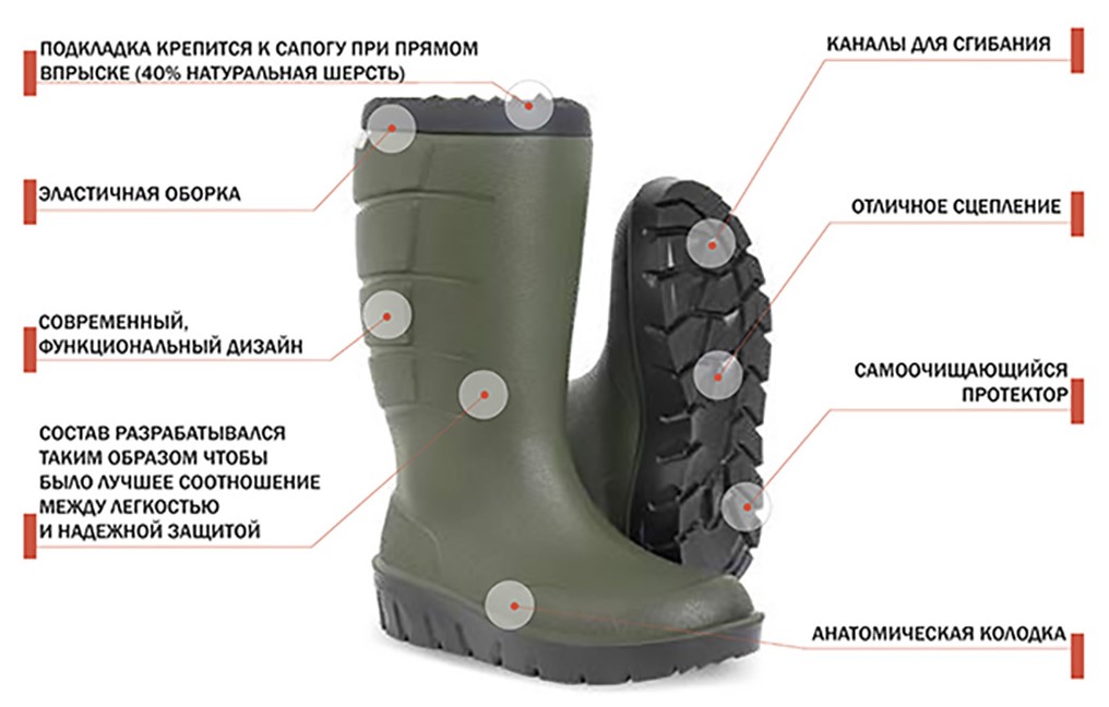 • толщина сапоги подобрана для достижения максимального баланса защиты от холода и сохранения эластичности изгибания сапога;
